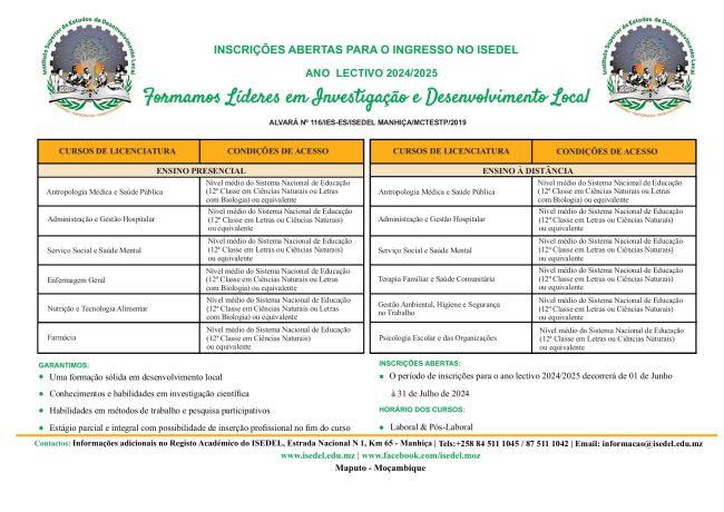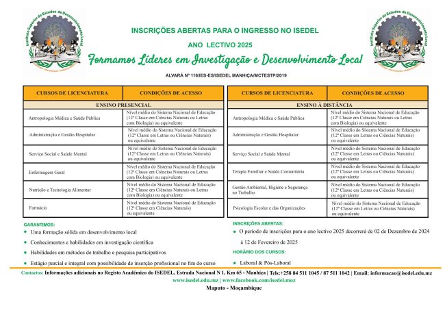 O Instituto Superior de Estudos de Desenvolvimento Local (ISEDEL) anuncia a abertura oficial das inscrições para o ano lectivo de 2026, num período que marca mais um passo na consolidação do compromisso da instituição com a formação de profissionais competentes, éticos e preparados para responder aos desafios do desenvolvimento nacional. As inscrições decorrem de 1…