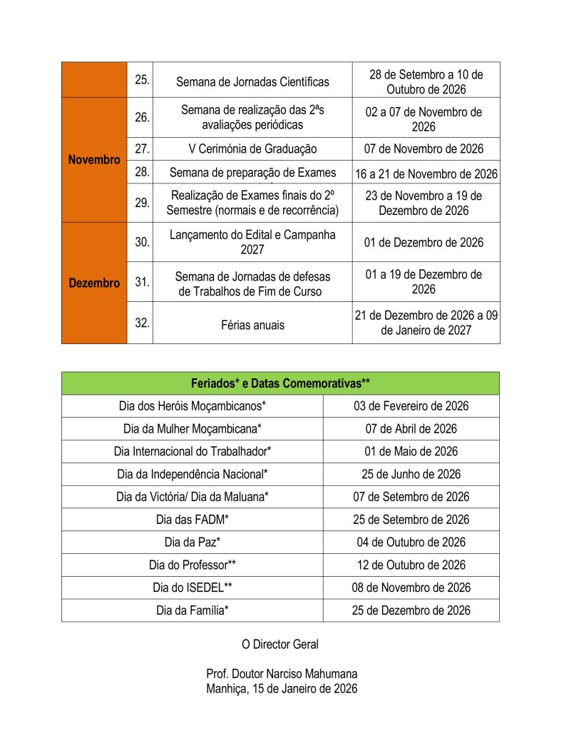Category: News01/15/2026Post navigationPreviousPrevious post:Inscrições Abertas 2026: Garanta a Sua Vaga no ISEDELRelated PostsInscrições Abertas 2026: Garanta a Sua Vaga no ISEDEL12/01/2025ISEDEL gradua cerca de 300 estudantes11/14/2025Do ISEDEL à Direcção do Serviço Distrital de Saúde, Mulher e Acção Social de Morrumbene: Conheça Namizio Guambe08/04/2025Chefe de Secção Distrital da Farmácia em Morrumbene fala da sua formação no ISEDEL07/14/2025Inscrições para o ano lectivo 2025/202606/04/2025Calendário Académico do Ano Lectivo 202502/01/2025